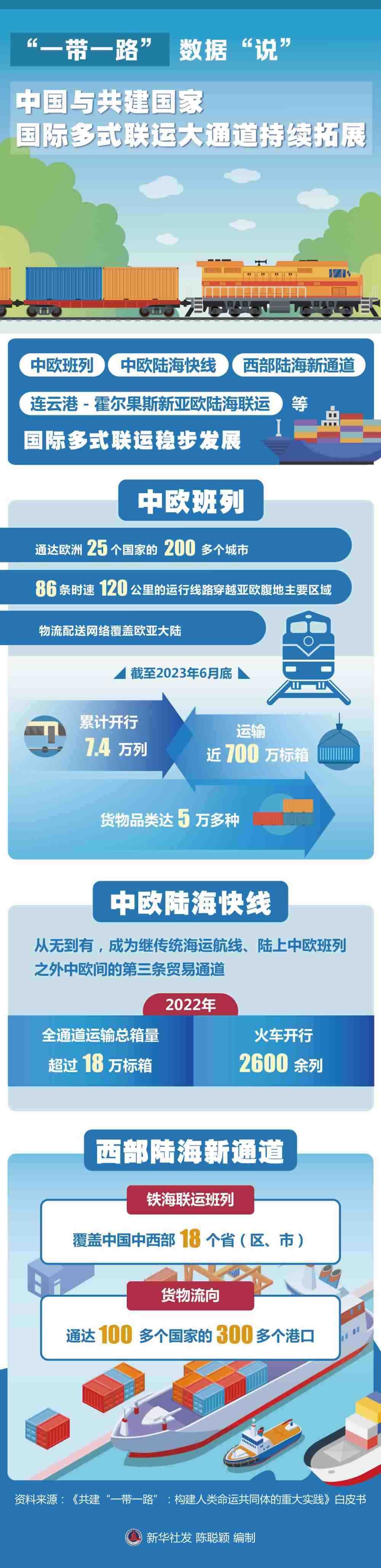 國際多式聯(lián)運大通道持續(xù)拓展。中歐班列、中歐陸海快線、西部陸海新通道、連云港-霍爾果斯新亞歐陸海聯(lián)運等國際多式聯(lián)運穩(wěn)步發(fā)展。中歐班列通達歐洲25個國家的200多個城市,86條時速120公里的運行線路穿越亞歐腹地主要區(qū)域,物流配送網(wǎng)絡(luò)覆蓋歐亞大陸;截至2023年6月底,中歐班列累計開行7.4萬列,運輸近700萬標(biāo)箱,貨物品類達5萬多種,涉及汽車整車、機械設(shè)備、電子產(chǎn)品等53大門類,合計貨值超3000億美元。中歐陸??炀€從無到有,成為繼傳統(tǒng)海運航線、陸上中歐班列之外中歐間的第三條貿(mào)易通道,2022年全通道運輸總箱量超過18萬標(biāo)箱,火車開行2600余列。西部陸海新通道鐵海聯(lián)運班列覆蓋中國中西部18個?。▍^(qū)、市),貨物流向通達100多個國家的300多個港口。