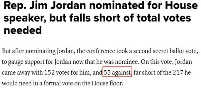 據(jù)報(bào)道,喬丹13日贏得提名后,共和黨人立刻舉行了第二輪閉門投票,以檢驗(yàn)喬丹所獲黨內(nèi)支持情況。結(jié)果顯示,152名共和黨人將在全院表決中投贊成票,55名共和黨人將投反對票。