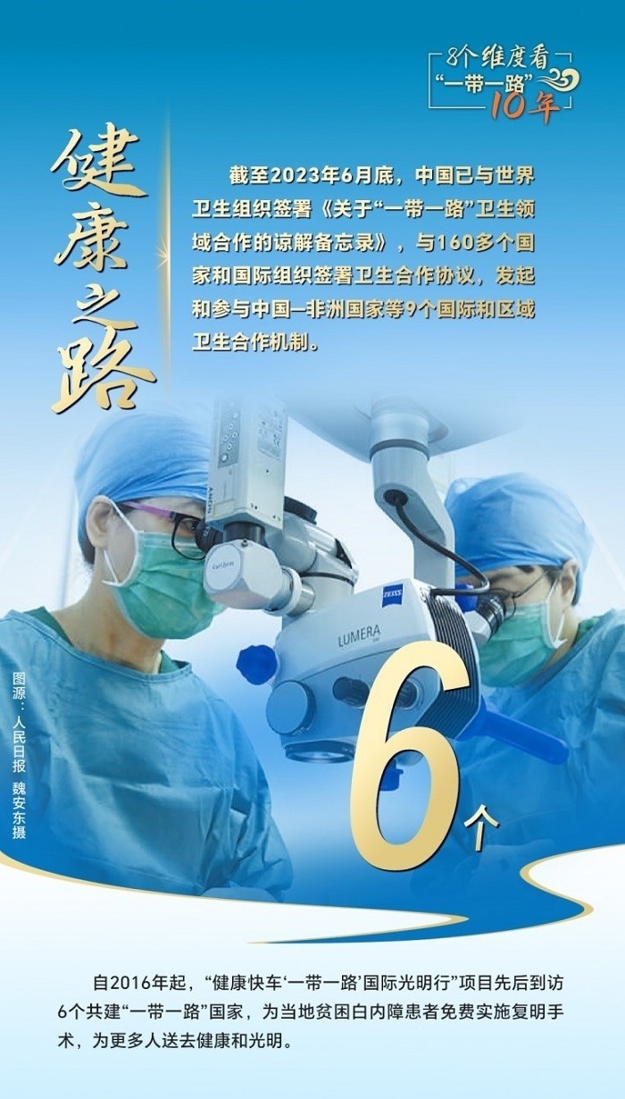 截至2023年6月底,中國已與世界衛(wèi)生組織簽署《關于“一帶一路”衛(wèi)生領域合作的諒解備忘錄》,與160多個國家和國際組織簽署衛(wèi)生合作協(xié)議,發(fā)起和參與中國—非洲國家、中國—阿拉伯國家、中國—東盟衛(wèi)生合作等9個國際和區(qū)域衛(wèi)生合作機制。為共建國家培養(yǎng)數(shù)萬名衛(wèi)生管理、公共衛(wèi)生、醫(yī)學科研等專業(yè)人才,向58個國家派出中國醫(yī)療隊,赴30多個國家開展“光明行”,免費治療白內(nèi)障患者近萬名,與湄公河流域國家、中亞國家、蒙古國等周邊國家開展跨境醫(yī)療合作,衛(wèi)生健康合作成效顯著。