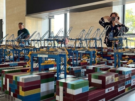 考察團成員拍照記錄青島港全自動化碼頭布局