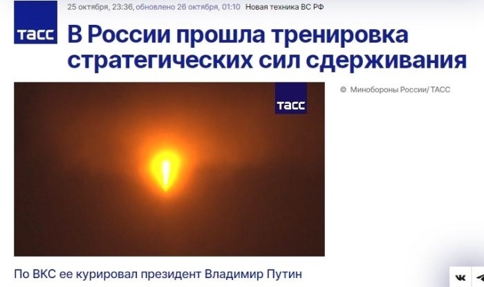 中新網(wǎng)10月27日電 據(jù)塔斯社報道,當(dāng)?shù)貢r間25日,在俄軍最高統(tǒng)帥、俄總統(tǒng)普京的指揮下,俄羅斯武裝部隊進行了戰(zhàn)略核威懾力量演習(xí)。