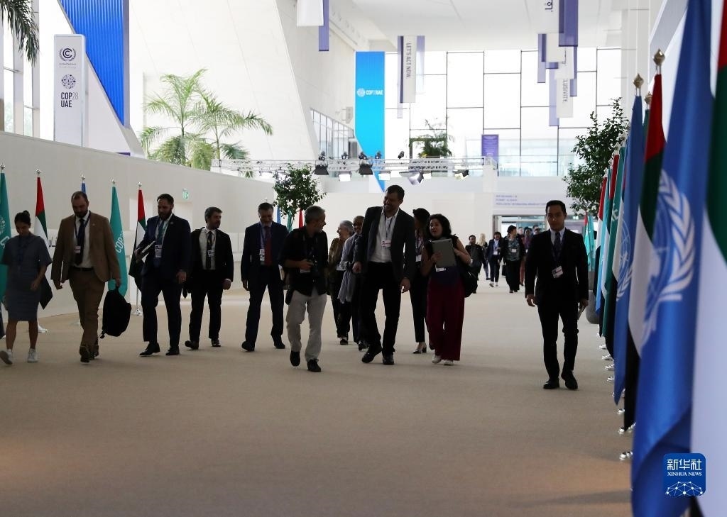 12月12日,在阿聯(lián)酋迪拜,參會人員走在聯(lián)合國氣候變化迪拜大會會場內(nèi)。新華社記者 王東震 攝