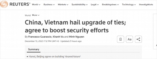 路透社12月13日報道稱,中國和越南宣布,兩國簽署了數十項合作協議,同意加強安全事務合作,共同構建“命運共同體”。