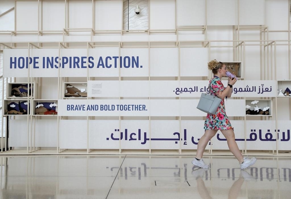 12月12日,在阿聯(lián)酋迪拜,一名女子走在聯(lián)合國氣候變化迪拜大會會場內(nèi)。新華社記者王東震攝