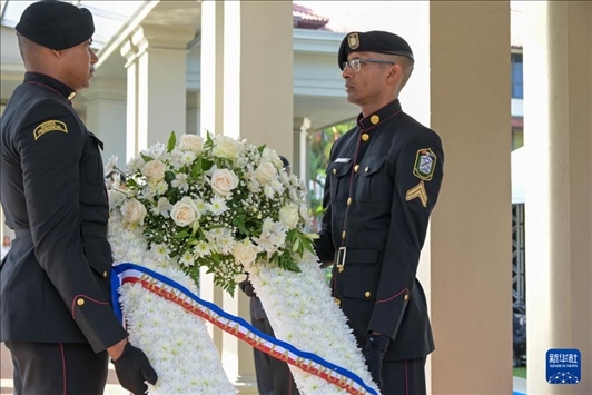 1月9日,在巴拿馬首都巴拿馬城,兩名士兵向紀念“護旗運動”的“永恒之火”紀念碑獻花圈。新華社記者 陳昊佺 攝