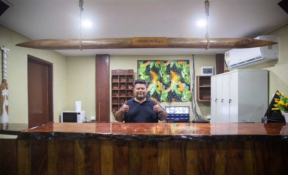 2月2日,在位于瑙魯島東南部的“阿夸里里”客棧內(nèi),客棧老板丹尼爾在向記者致意。新華社發(fā)(胡涇辰攝)