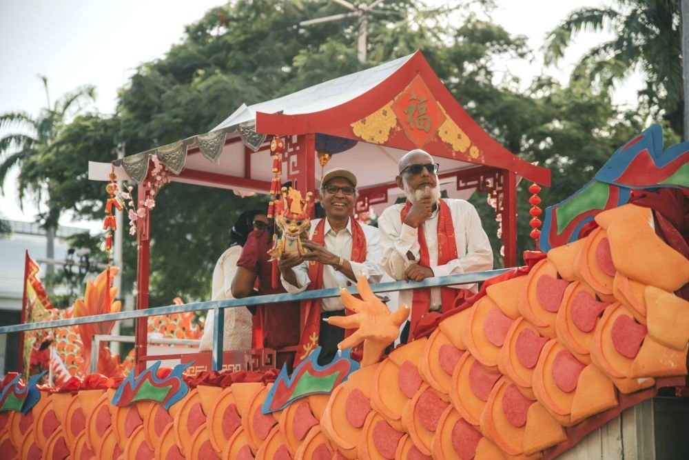 2月3日,在毛里求斯首都路易港,毛里求斯副總理胡斯努(左)參加花車巡游活動(dòng)。新華社發(fā)(中國(guó)駐毛里求斯大使館供圖)