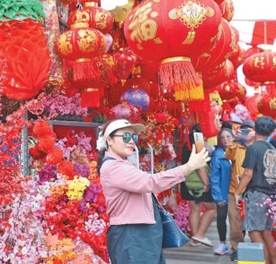 春節(jié)期間,印度尼西亞首都雅加達的中國城一派喜慶氣氛。圖為當?shù)厥忻裨诮诌吷啼佔耘摹?/p>
