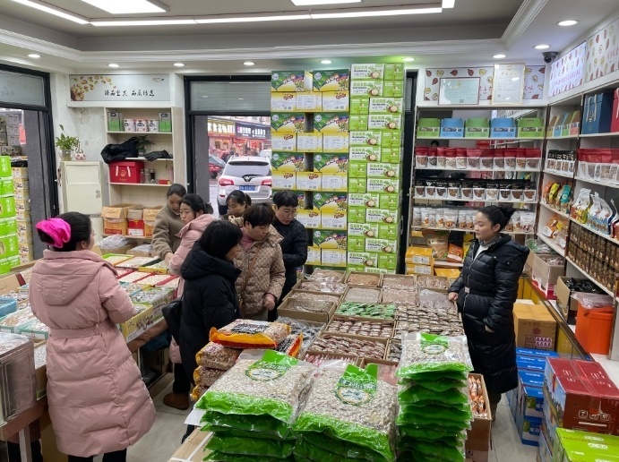 這是湖南長沙高橋大市場堅(jiān)果經(jīng)銷商李海麗(右一)在向顧客介紹非洲堅(jiān)果。新華社記者 余春生 攝