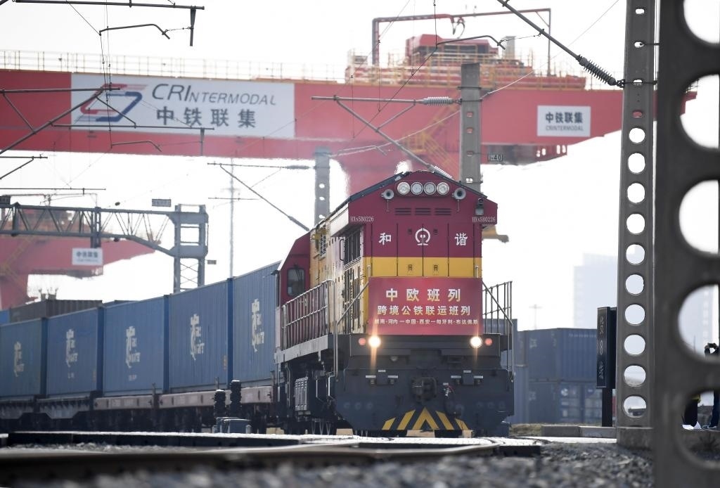 ?3月7日,中歐班列(越南·河內(nèi)——中國·西安——匈牙利·布達(dá)佩斯)跨境公鐵聯(lián)運(yùn)班列從西安國際港站駛出。新華社記者李一博攝