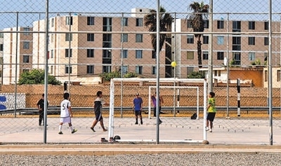 當地青少年在項目方修建的足球場內踢球。