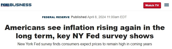 福克斯商業(yè)頻道在其另一篇報道中提到,據(jù)8日公布的一項紐約聯(lián)邦儲備銀行(Federal Reserve Bank of New York)進行的消費者預(yù)期調(diào)查顯示,美國人正在為未來幾年的高通脹率做準(zhǔn)備,公眾普遍的預(yù)期中值為從現(xiàn)在起一年內(nèi)通脹率將上升3%,與前幾個月持平,并在未來幾年通脹將保持高位,這表明他們認為粘性通脹恐會持續(xù)下去。