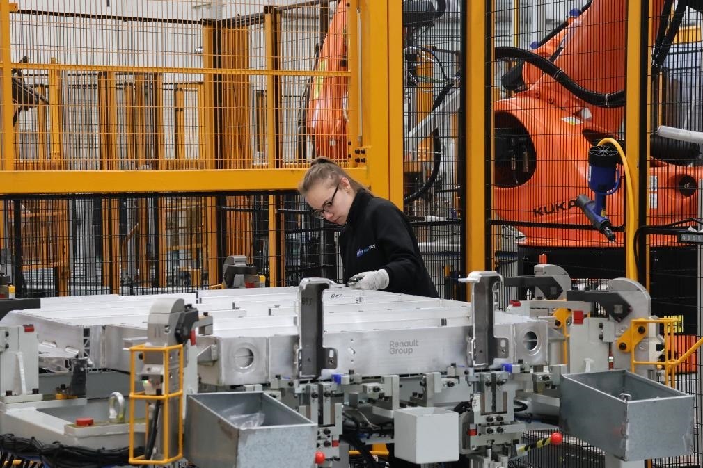 ?2月23日,在法國呂茨,中國敏實集團與法國雷諾集團成立的合資公司的員工在電池盒產(chǎn)線上工作。新華社記者張百慧攝