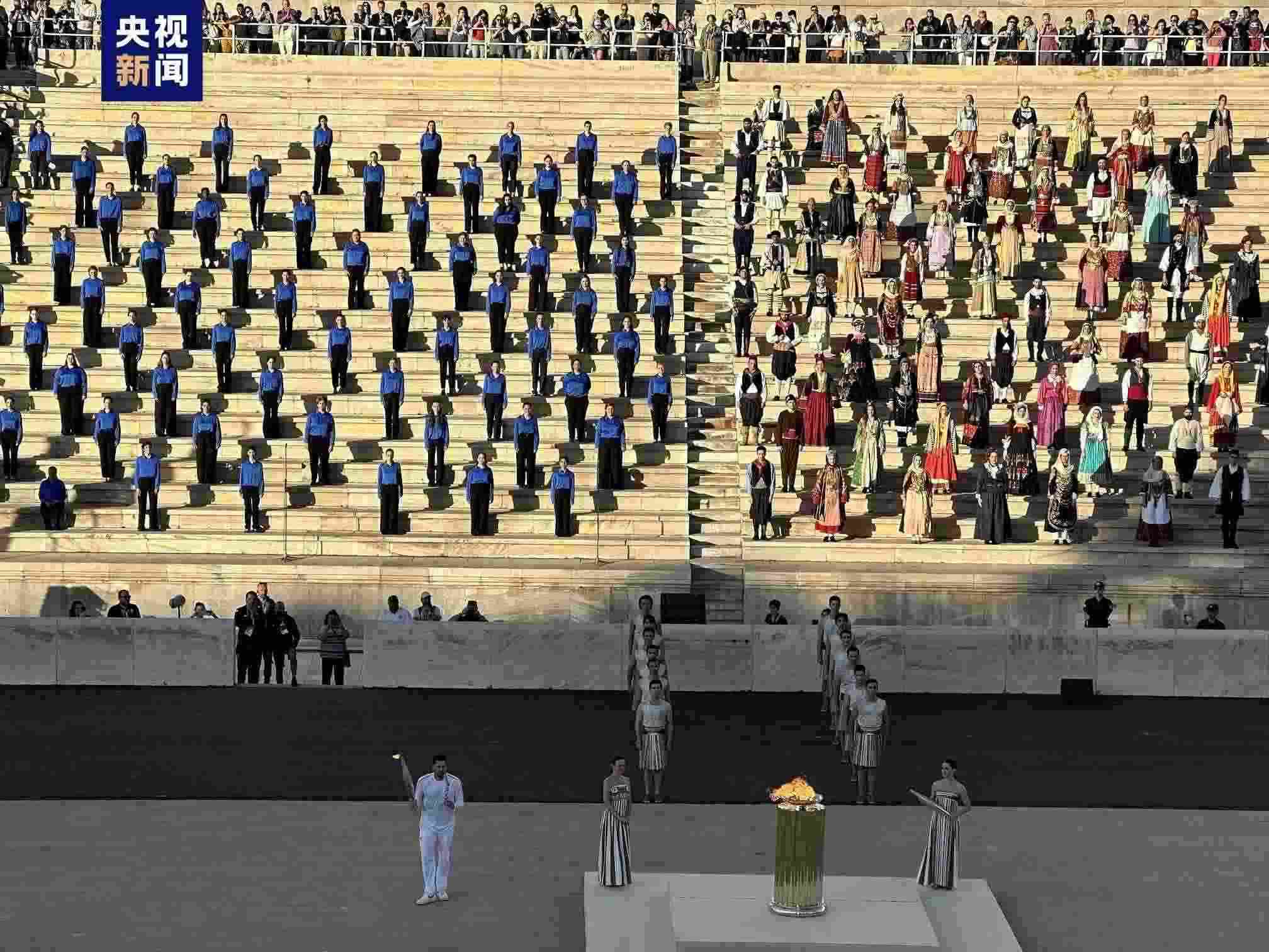 當(dāng)?shù)貢r(shí)間4月26日,在巴黎奧運(yùn)會(huì)火種交接儀式現(xiàn)場,巴黎奧運(yùn)會(huì)希臘境內(nèi)最后一棒火炬手、希臘男子國家水球隊(duì)隊(duì)長揚(yáng)尼斯·豐圖利斯點(diǎn)燃了會(huì)場的火種盆,完成了火炬在希臘境內(nèi)的傳遞。(總臺(tái)記者 楊明交)