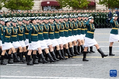 5月9日,在俄羅斯首都莫斯科,女兵列隊走過紅場。新華社記者 白雪騏 攝