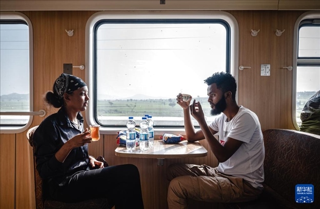 2023年9月9日,乘客在亞吉鐵路列車的餐車內(nèi)交談。新華社記者 王冠森 攝
