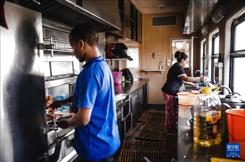 2023年9月9日,工作人員在亞吉鐵路列車上準(zhǔn)備餐食。新華社記者 王冠森 攝