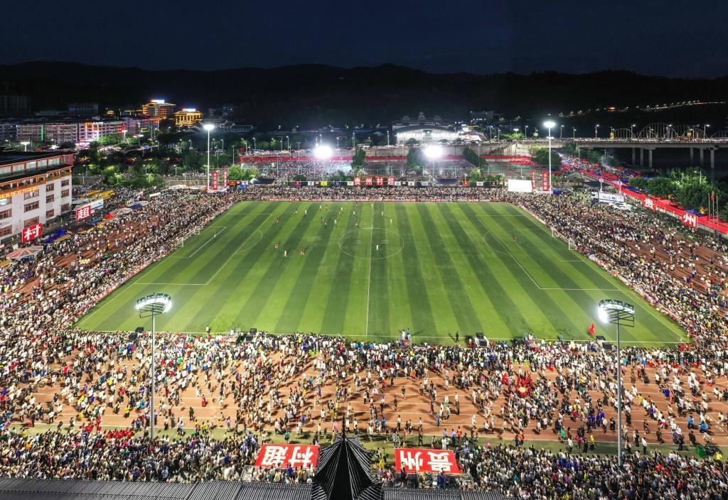 ?2023年7月1日,人們在觀看貴州“村超”足球賽(無人機(jī)照片)。新華社記者楊文斌攝