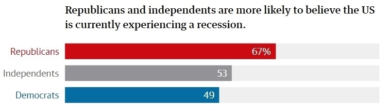 哈里斯民調(diào)公司進行的民調(diào)顯示,67%的共和黨人認為,美國經(jīng)濟正在萎縮,通貨膨脹正在加劇,整體經(jīng)濟正在惡化;而民主黨人中持相同觀點的人只有49%;此外,共和黨人比民主黨人更加相信,拜登政府的管理不善導(dǎo)致經(jīng)濟惡化。
