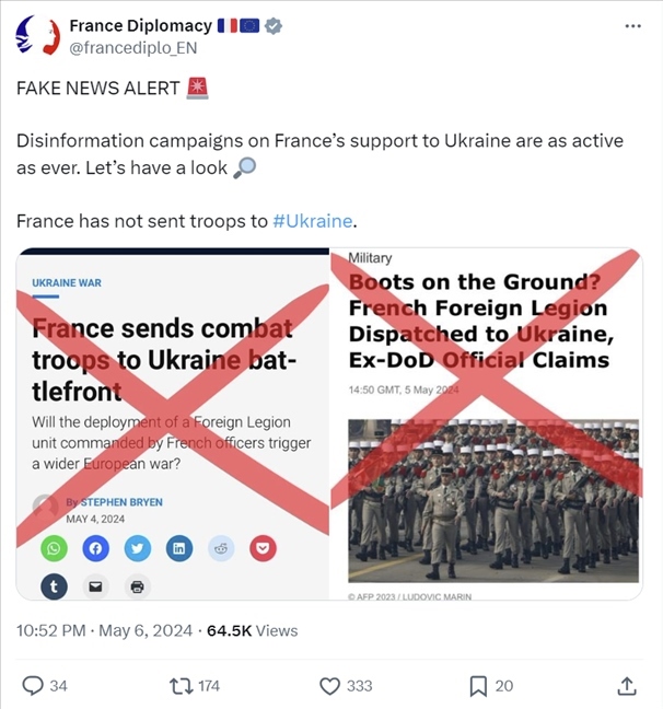 5月6日,法國外交部在X平臺上明確表示,“法國還沒有向烏克蘭派兵。”