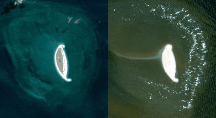 “伊爾薩 ”氣旋一周前(左)和三天后(右)由哨兵-2拍攝的貝德奧島衛(wèi)星圖像(圖片來(lái)自歐洲航天局,ESA)。施普林格·自然/供圖