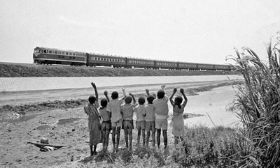 贊比亞魯西瓦西湖畔的少年兒童歡迎坦贊鐵路的列車通到他們的家鄉(xiāng)(1976年攝)。新華社發(fā)