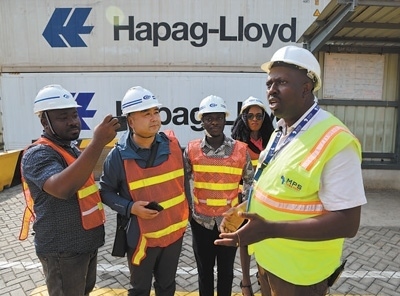 中加兩國媒體記者在特馬新集裝箱碼頭采訪工作人員。本報記者 張志文攝