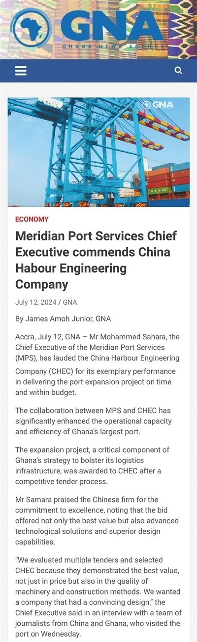 中國港灣為港口擴建項目提供了先進的技術(shù)解決方案和卓越的設(shè)計能力,并引入了多項創(chuàng)新技術(shù),包括能夠減少港口擁堵的停泊位窗口計劃,以及用于跟蹤和管理貨運的先進數(shù)字系統(tǒng),贏得了港口業(yè)主加納子午線港口服務有限公司高度肯定?!约蛹{通訊社報道
