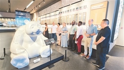 9月4日,在四川省成都市東安湖體育公園主體育場,“2024走進魅力成都”外國專家調研團成員在參觀成都大運會博物館的陳列。