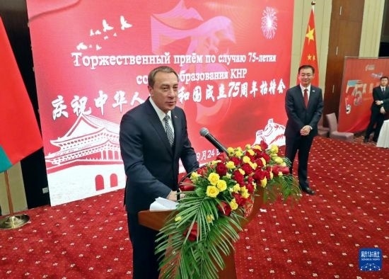 9月24日,白俄羅斯第一副總理尼古拉·斯諾普科夫在明斯克舉行的慶祝中華人民共和國成立75周年招待會上致辭。新華社發(fā)(任科夫攝)