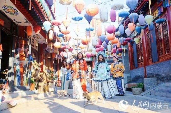 大盛魁博物館整體建筑風格為清末民國至上世紀40年代歸化城(今呼和浩特市)街區(qū)風貌。外媒記者“小姐姐”們現(xiàn)場“換裝”,體驗各式中華傳統(tǒng)服飾。來自巴勒斯坦國家電視臺的主持人拉尼婭·哈姆達拉,換了一身鮮艷的橘色服飾,行走園中,宛若“穿越”時光。