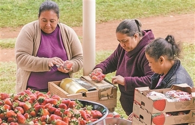 中國三峽巴西公司在位于巴西南部格利保吉水電站周邊開展創(chuàng)收創(chuàng)業(yè)試點項目。圖為當地農戶正在分裝草莓。納塔利婭·弗洛爾攝