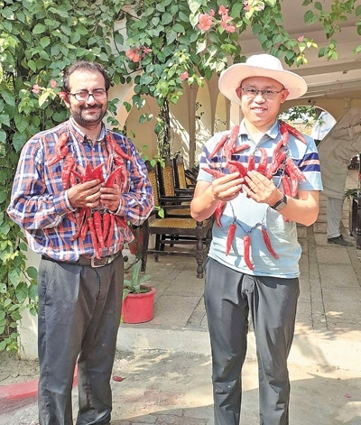 參與中國—巴基斯坦辣椒種植合作項目的中國專家與當地技術員共同慶祝辣椒豐收。本報巴基斯坦分社 瓦卡斯·阿赫邁德攝