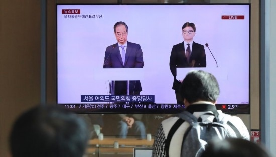 12月8日,在韓國首爾火車站,民眾觀看韓國執(zhí)政黨黨首韓東勛與國務總理韓德洙(左)共同會見記者的電視直播。新華社記者 姚琪琳 攝