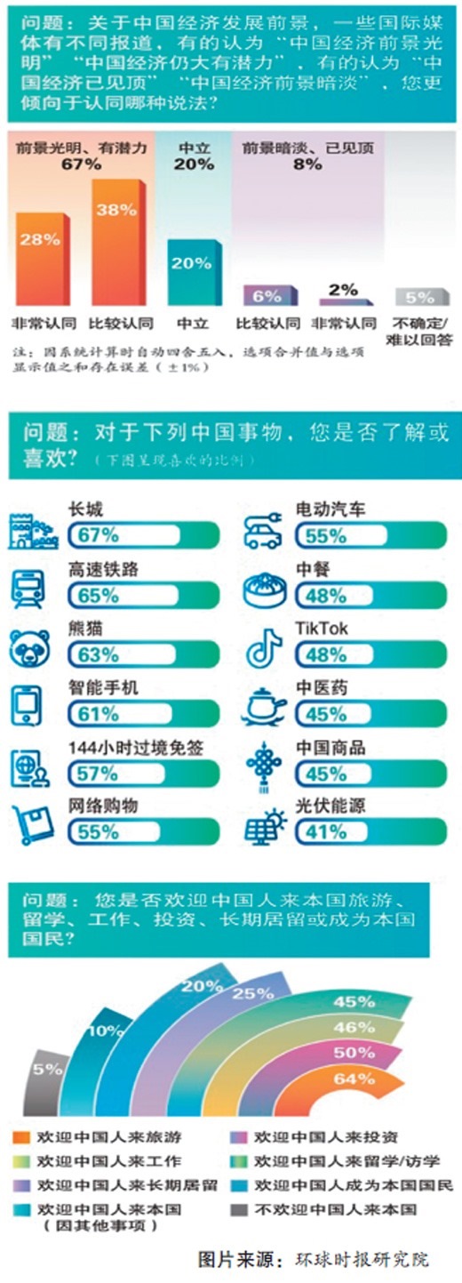 本次調(diào)查還列舉了10余項(xiàng)有代表性的中國(guó)事物,并逐一向國(guó)外民眾詢問喜愛與否。其中,長(zhǎng)城(67%)、高鐵(65%)、熊貓(63%)、智能手機(jī)(61%)的獲喜愛比例超過六成,過境免簽(57%)、電動(dòng)汽車(55%)和網(wǎng)絡(luò)購物(55%)的獲喜愛比例超過半數(shù),中餐(48%)和TikTok(48%)的獲喜愛比例接近半數(shù)。