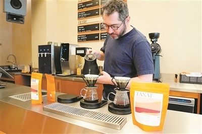 法國知名精品咖啡烘焙品牌TANAT今年推出兩款產(chǎn)自云南保山紅龍莊園的小粒咖啡產(chǎn)品。該品牌首席烘焙師托馬·克萊芒表示,所選的云南咖啡豆口感柔和細膩,兼具豐富的層次與地域特色。圖為該品牌位于巴黎的一家門店內(nèi),咖啡師在沖泡云南咖啡。