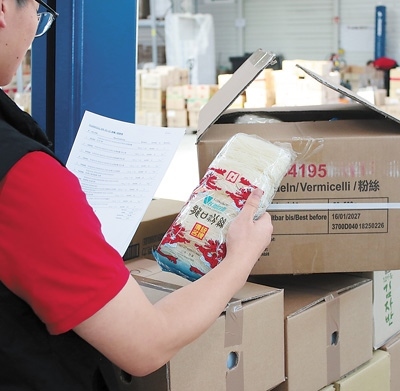 圖為東方超市員工在清點剛運抵貨運中心的龍口粉絲。作為中國最早與歐盟互認的地理標(biāo)志產(chǎn)品之一,龍口粉絲一直深受德國顧客的青睞。