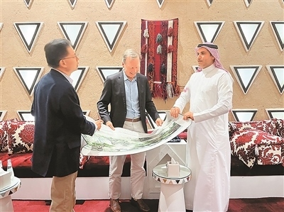 尼爾·布什(中)與Skytower Investments首席執(zhí)行官方洪(左),向沙特阿拉伯國(guó)家工業(yè)發(fā)展與物流計(jì)劃署首席執(zhí)行官蘇萊曼·本·哈立德·馬茲魯阿(右)贈(zèng)送中國(guó)絲綢畫(huà)卷。
