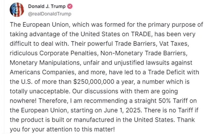 他說,美歐之間的磋商停滯不前。“因此,我建議自2025年6月1日起,對歐盟商品統(tǒng)一征收50%關(guān)稅。若產(chǎn)品在美國本土生產(chǎn)制造,則免征關(guān)稅。”
