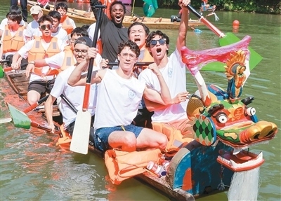 去年,我參加了由杭州余杭區(qū)五常街道組織的龍舟體驗營,親身感受競渡帶來的“速度與激情”。我和同校好友組成隊伍,伴著耳邊觀眾的熱情歡呼揮槳出發(fā),濺起的水花在河道綻放。握槳、入水、拉水、出水、回槳……隨著龍舟劃至終點,我們揮舞校旗、舉槳歡呼。在龍舟運動中,我感受到了奮斗和團結的力量——不同膚色的人們在同一條水道上并肩奮進,這不正是“同舟共濟”的東方智慧嗎!