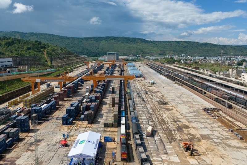 7月4日,“鄭和號(hào)”海公鐵國(guó)際多式聯(lián)運(yùn)班列首發(fā)列車從昆明市騰俊國(guó)際陸港公鐵聯(lián)運(yùn)中心順利發(fā)車(無(wú)人機(jī)照片)。