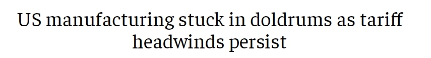此外,印度《經(jīng)濟(jì)時(shí)報(bào)》2日發(fā)表題為《關(guān)稅阻力持續(xù)存在 美國(guó)制造業(yè)陷入低迷》的文章。文章指出,11月,美國(guó)制造業(yè)連續(xù)第九個(gè)月萎縮,工廠面臨訂單下滑和原材料價(jià)格上漲的雙重困境,進(jìn)口關(guān)稅的拖累持續(xù)存在。