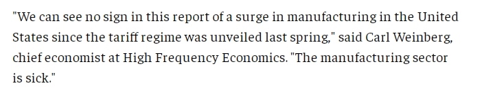 文章指出,美國(guó)政府曾辯稱,加征關(guān)稅是保護(hù)美國(guó)國(guó)內(nèi)制造業(yè)的必要之舉,但經(jīng)濟(jì)學(xué)家則認(rèn)為,由于包括勞動(dòng)力短缺在內(nèi)的結(jié)構(gòu)性問(wèn)題,美國(guó)制造業(yè)已無(wú)法恢復(fù)昔日輝煌。文章援引高頻經(jīng)濟(jì)咨詢公司首席經(jīng)濟(jì)學(xué)家卡爾·溫伯格(Carl Weinberg)的話表示,“從(ISM)這份報(bào)告中,我沒(méi)有看到自關(guān)稅政策出臺(tái)以來(lái),美國(guó)制造業(yè)出現(xiàn)任何增長(zhǎng)的跡象,美國(guó)制造業(yè)已經(jīng)病了?!?/p>