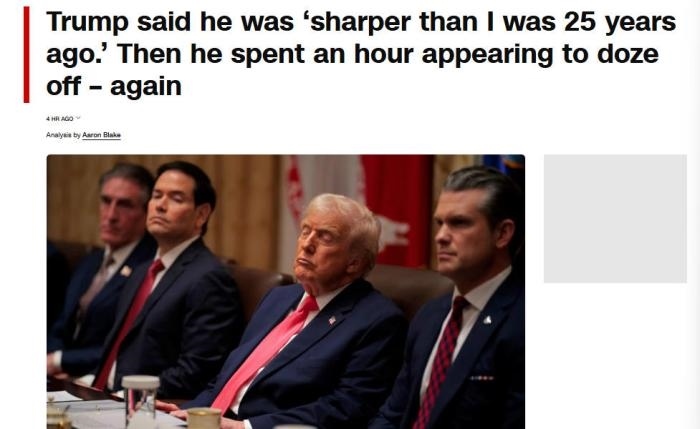 美國有線電視新聞網(wǎng)(CNN)注意到,當(dāng)美國商務(wù)部長(zhǎng)盧特尼克談及貿(mào)易戰(zhàn)時(shí),特朗普“似乎難以睜開眼睛”。在美國教育部長(zhǎng)麥克馬洪和美國衛(wèi)生與公眾服務(wù)部長(zhǎng)小羅伯特·肯尼迪發(fā)言時(shí),特朗普“似乎僵住了,閉著眼睛,每次持續(xù)10到15秒,然后才轉(zhuǎn)動(dòng)眼球或點(diǎn)頭”。