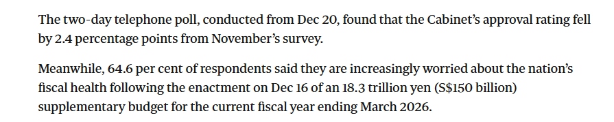 報(bào)道指出,目前進(jìn)口化石燃料占日本發(fā)電量的60%-70%,是推高通脹的主要因素之一,也已影響自民黨支持率。而日本共同社21日公布的最新民調(diào)顯示,高市早苗內(nèi)閣支持率較11月的調(diào)查下降了2.4個(gè)百分點(diǎn),有64.6%的受訪(fǎng)者表示,隨著本月16日2025財(cái)年追加預(yù)算案的通過(guò),他們對(duì)國(guó)家財(cái)政狀況的擔(dān)憂(yōu)日益加劇。