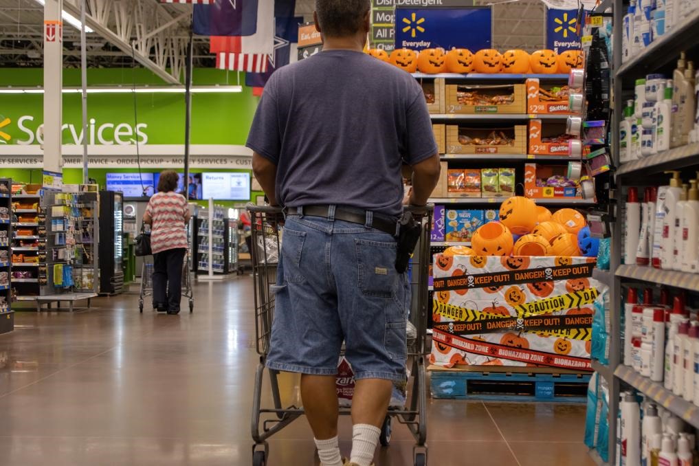 2022年8月31日,在美國得克薩斯州普萊諾市,一名男子隨身攜帶槍支逛超市。新華社發(fā)(金新攝)