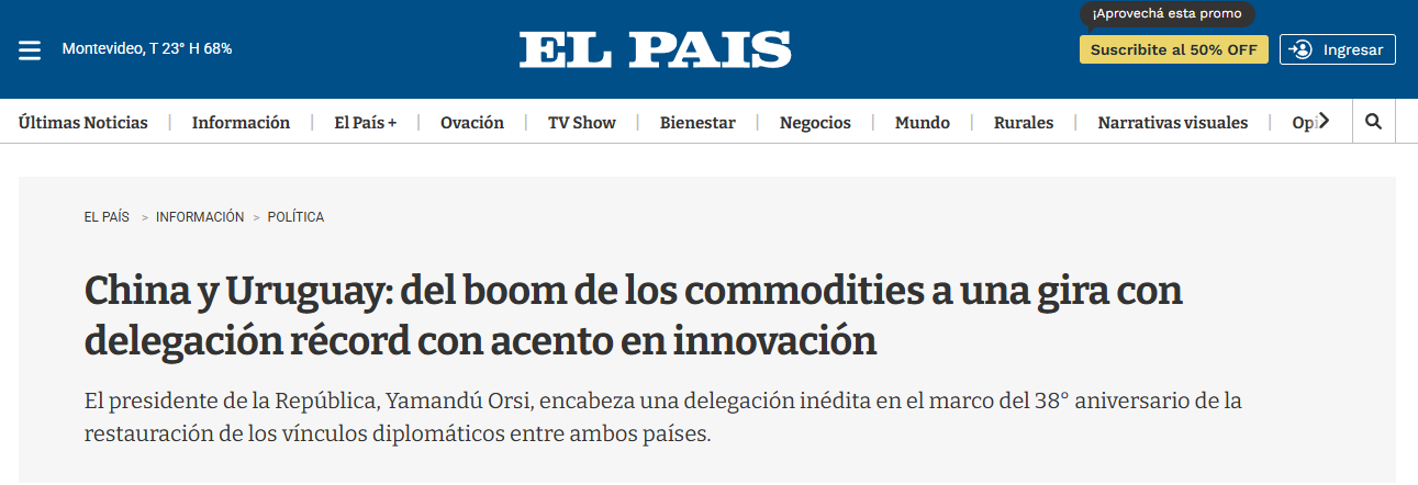 南美新聞機(jī)構(gòu)Merco Press報(bào)道稱,此次訪問正值烏拉圭與中國(guó)建交38周年,烏拉圭總統(tǒng)奧爾西率領(lǐng)約150人的代表團(tuán)啟程訪華,旨在“加強(qiáng)與烏拉圭最大貿(mào)易伙伴之間的經(jīng)濟(jì)聯(lián)系”。