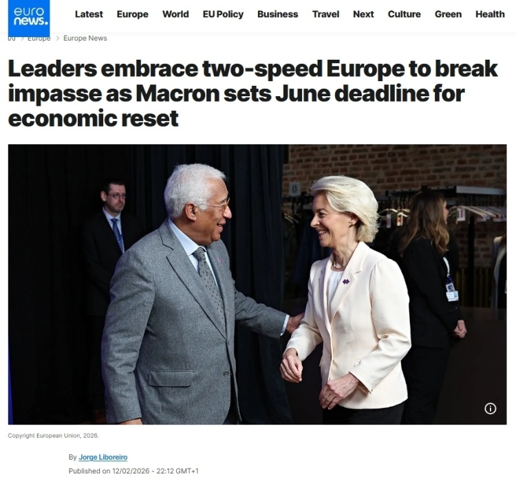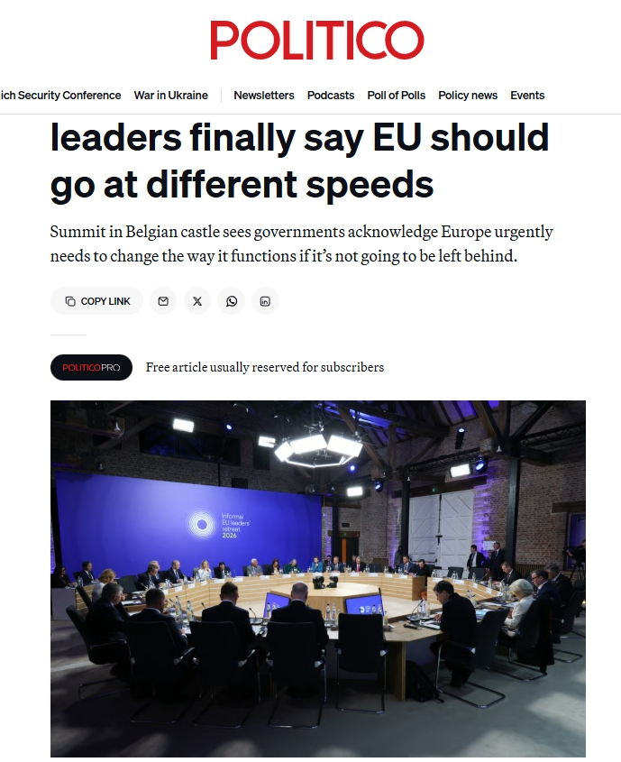 《政治報》網(wǎng)站歐洲版的報道評論稱,歐盟一直以其成員國團結(jié)一致向前邁進而自豪,那個時代已經(jīng)結(jié)束了。2月12日在比利時舉行的會議上,法國、德國、意大利等多國領(lǐng)導人支持,最早將于下個月的歐洲理事會上形成一項計劃,以簽署組成更小團體的倡議。各國政府表示,由于歐洲的許多想法陷入優(yōu)柔寡斷和不和諧之中,歐洲的競爭優(yōu)勢正在逐漸消失,因此他們感到一種緊迫感。