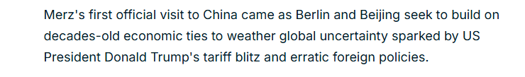 法國24新聞臺(tái)26日?qǐng)?bào)道稱,默茨總理首次對(duì)中國的正式訪問,恰逢德國和中國正努力鞏固數(shù)十年來建立的經(jīng)貿(mào)關(guān)系,以應(yīng)對(duì)美國濫施關(guān)稅政策造成的沖擊及其反復(fù)無常的外交政策引發(fā)的全球不確定性。