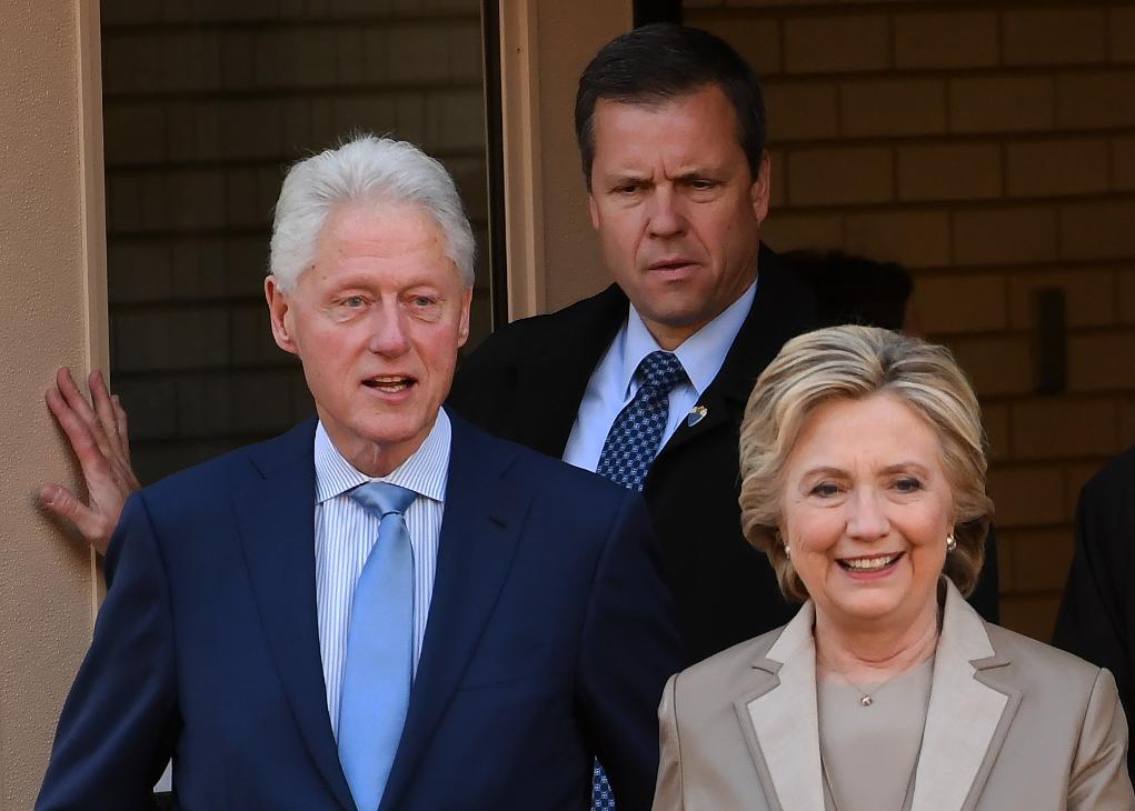 2016年11月8日,在美國紐約州查帕闊一處投票站,希拉里·克林頓(前右)與她的丈夫、前總統(tǒng)比爾·克林頓參加大選投票。新華社記者殷博古攝